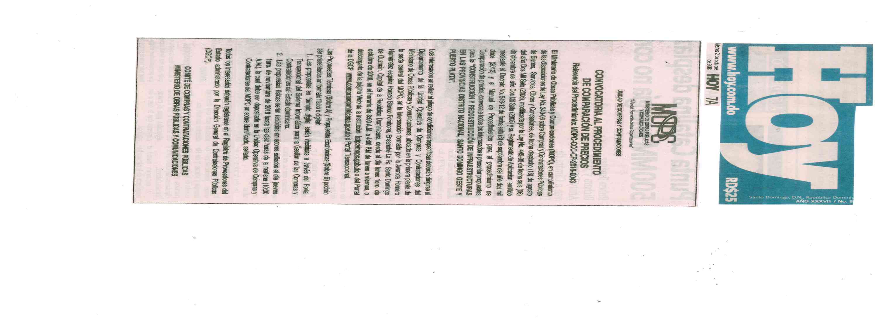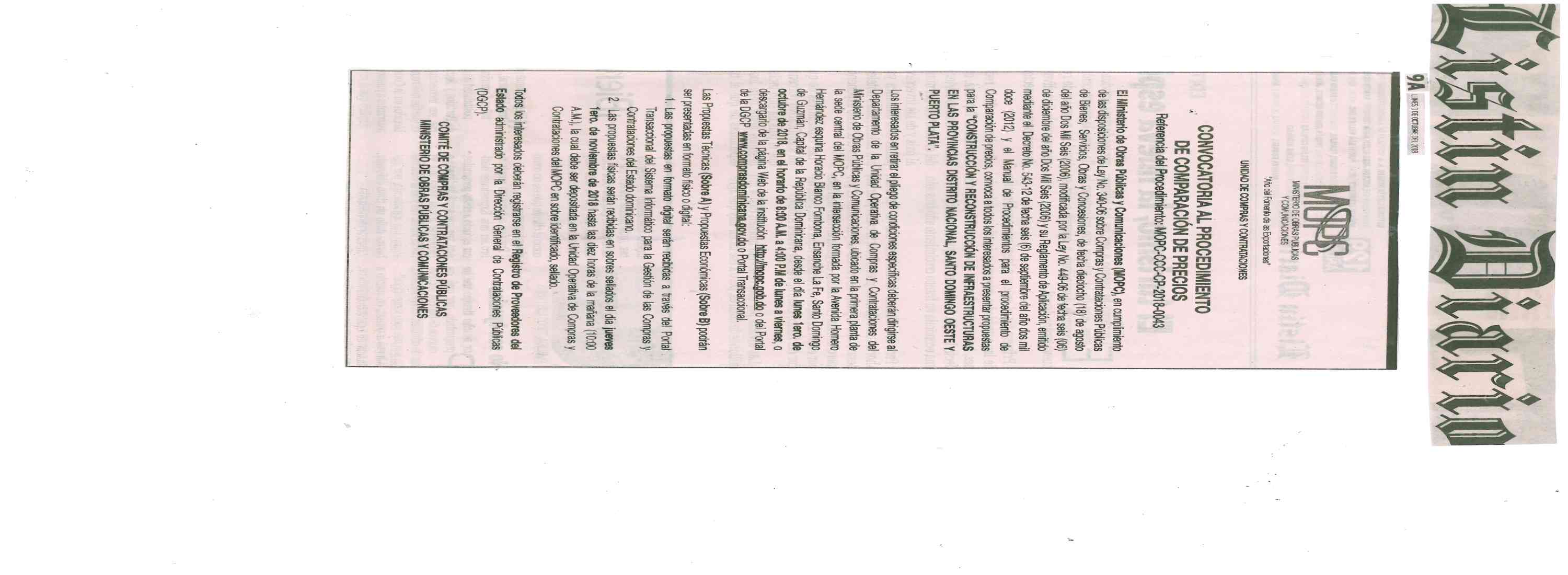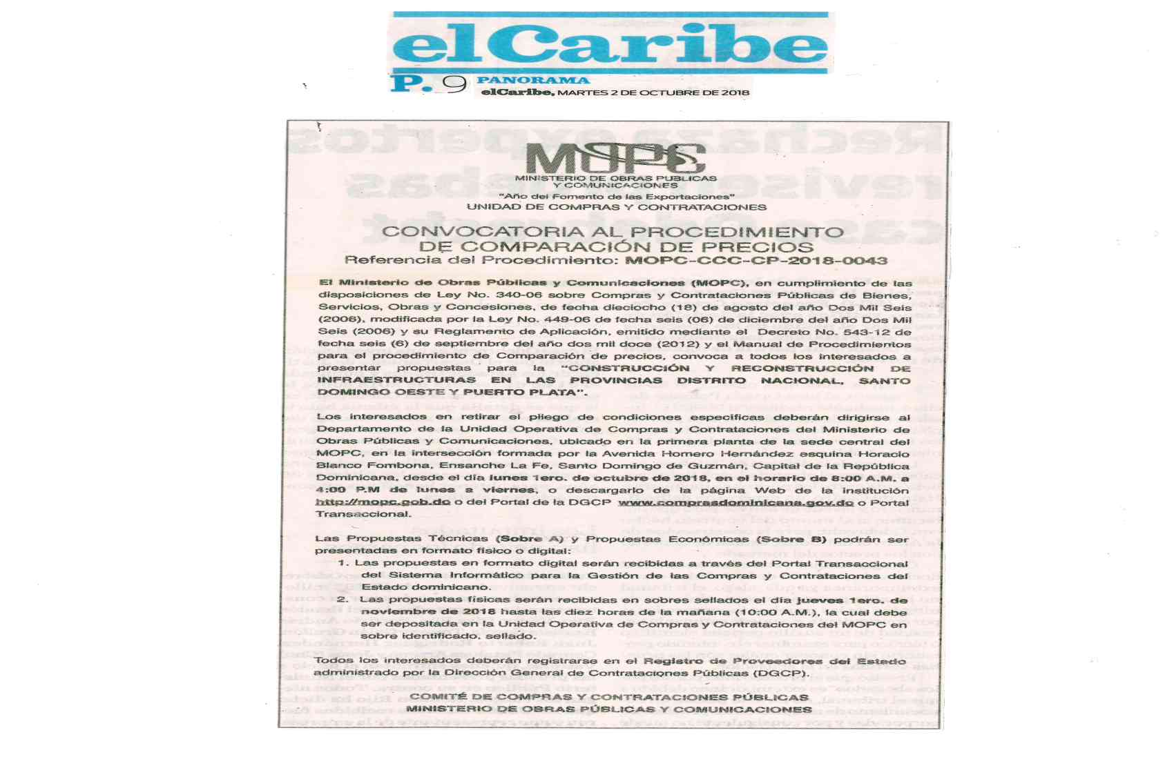 Ministerio de Obras Públicas y Comunicaciones (MOPC) en cumplimiento de las disposiciones de Ley No. 340-06 sobre Compras y Contrataciones Públicas de Bienes, Servicios, Obras y Concesiones, de fecha dieciocho (18) de agosto del año Dos Mil Seis (2006), modificada por la Ley No. 449-06 de fecha seis (06) de diciembre del año Dos Mil Seis (2006) y su Reglamento de Aplicación, emitido mediante el Decreto No. 543-12 de fecha seis (6) de septiembre del año dos mil doce (2012) y el Manual de Procedimientos para el procedimiento de Comparación de precios, convoca a todos los interesados a presentar propuestas para la “CONSTRUCCIÓN Y RECONSTRUCCIÓN DE INFRAESTRUCTURAS EN LAS PROVINCIAS DISTRITO NACIONAL, SANTO DOMINGO OESTE Y PUERTO PLATA”.