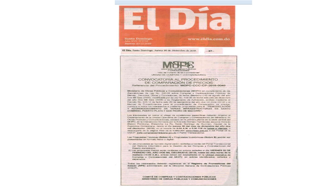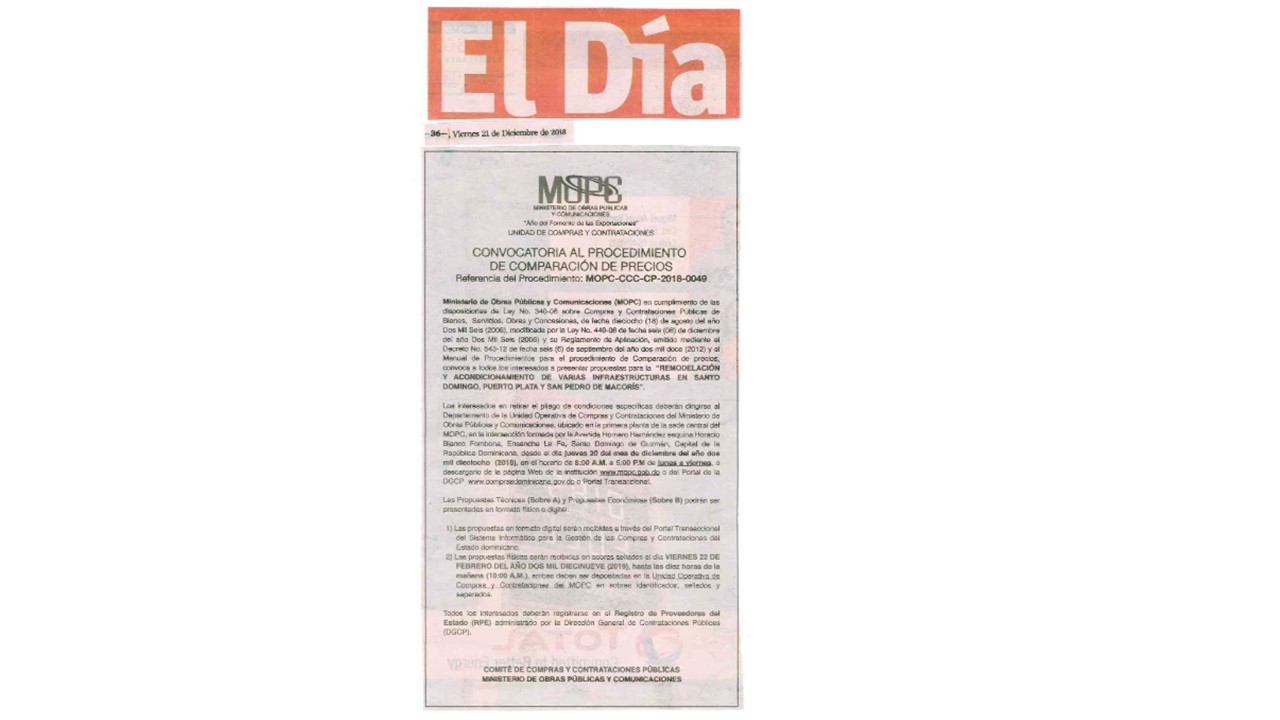 Ministerio de Obras Públicas y Comunicaciones (MOPC) en cumplimiento de las disposiciones de Ley No. 340-06 sobre Compras y Contrataciones Públicas de Bienes, Servicios, Obras y Concesiones, de fecha dieciocho (18) de agosto del año Dos Mil Seis (2006), modificada por la Ley No. 449-06 de fecha seis (06) de diciembre del año Dos Mil Seis (2006) y su Reglamento de Aplicación, emitido mediante el Decreto No. 543-12 de fecha seis (6) de septiembre del año dos mil doce (2012) y el Manual de Procedimientos para el procedimiento de Comparación de precios, convoca a todos los interesados a presentar propuestas para la “REMODELACIÓN Y ACONDICIONAMIENTO DE VARIAS INFRAESTRUCTURAS EN SANTO DOMINGO, PUERTO PLATA Y SAN PEDRO DE MACORÍS”