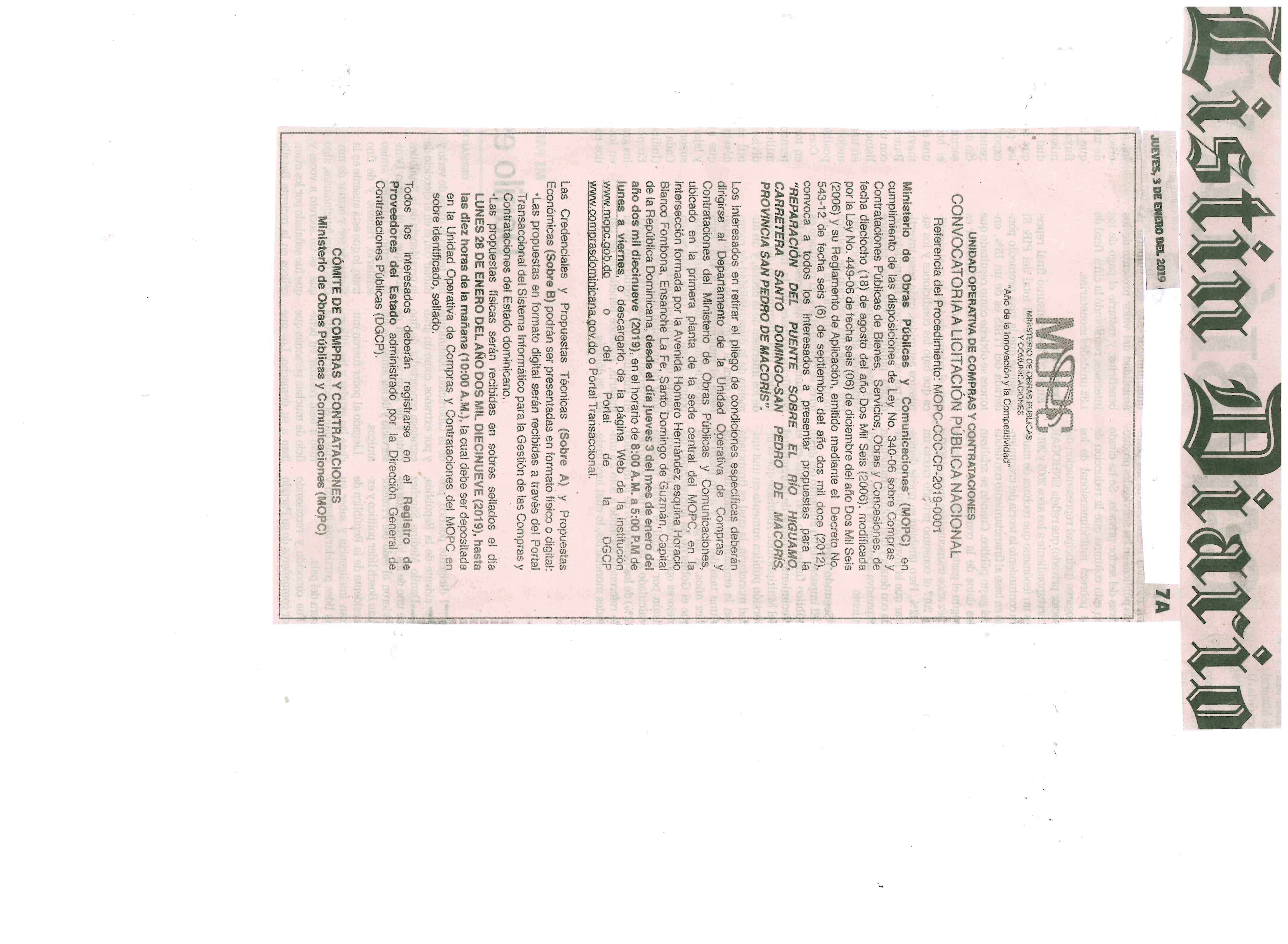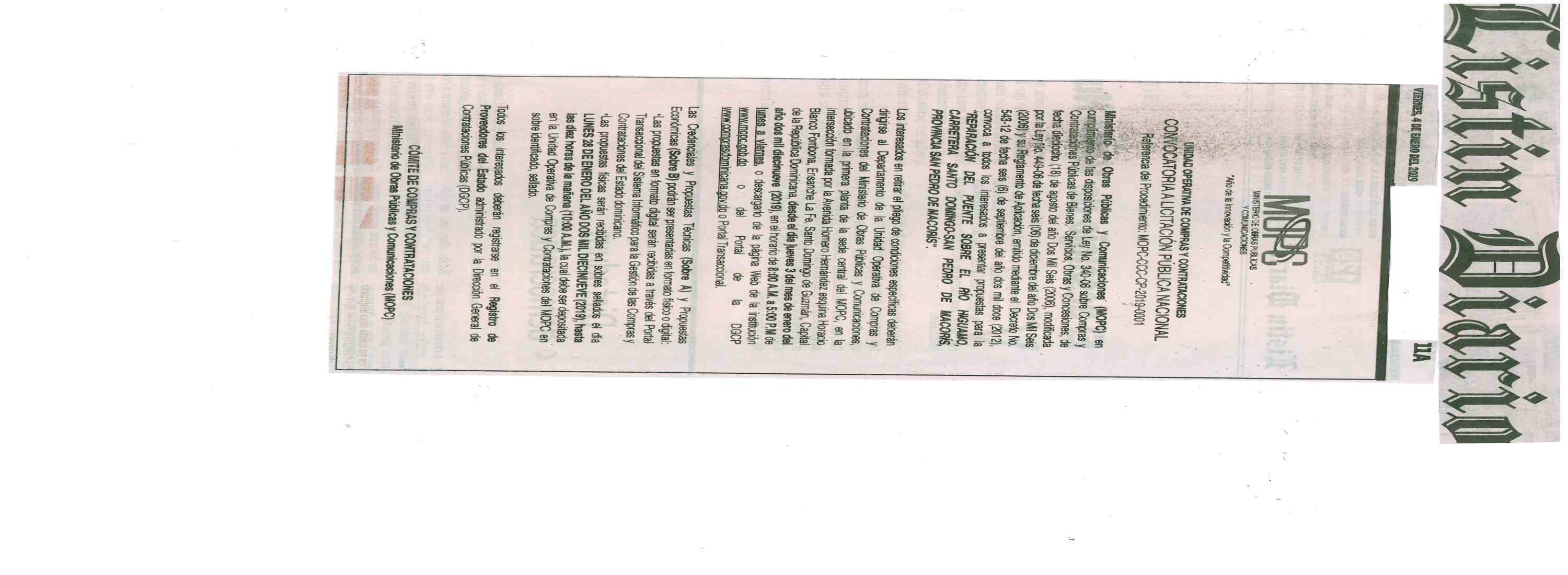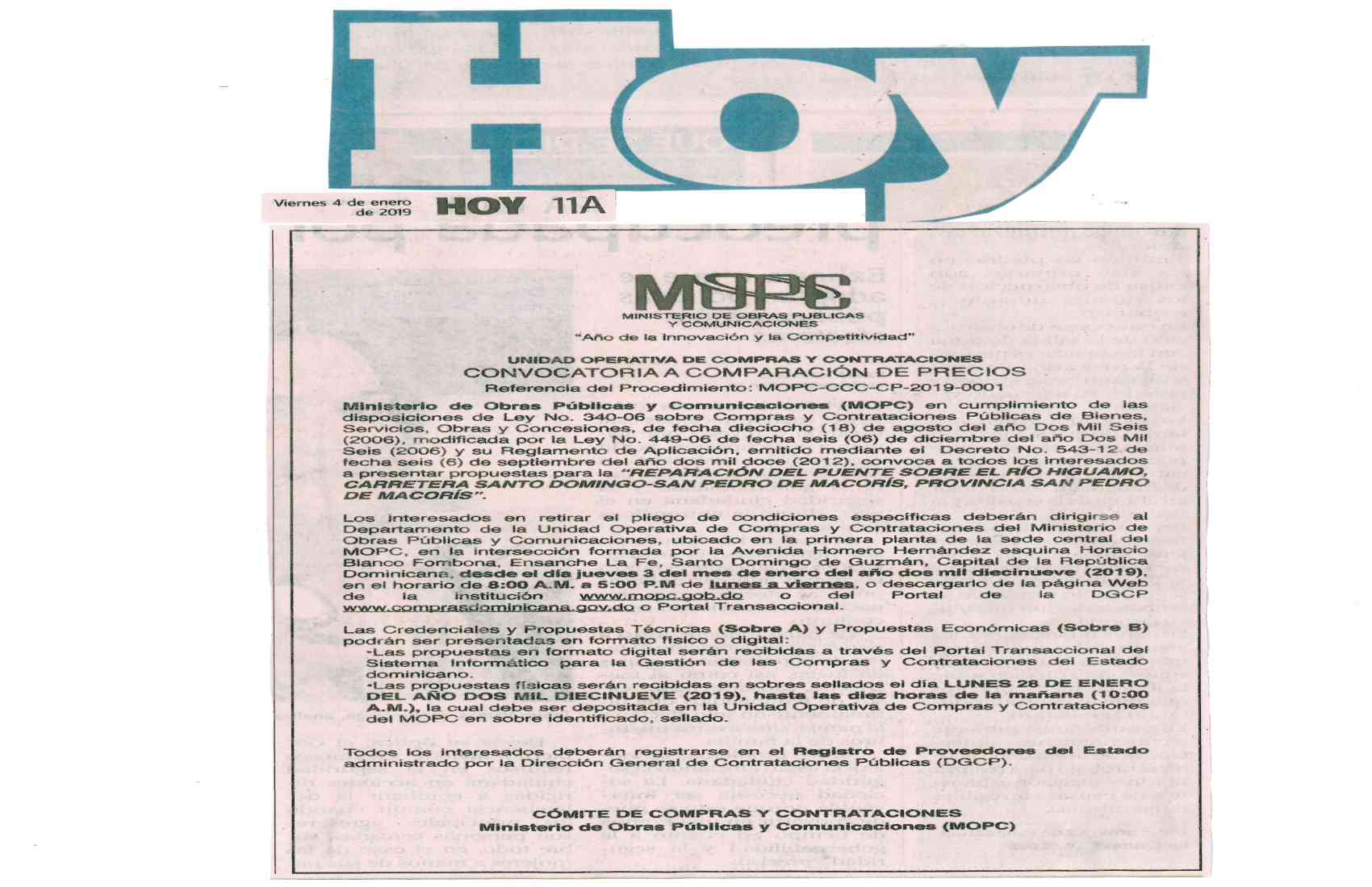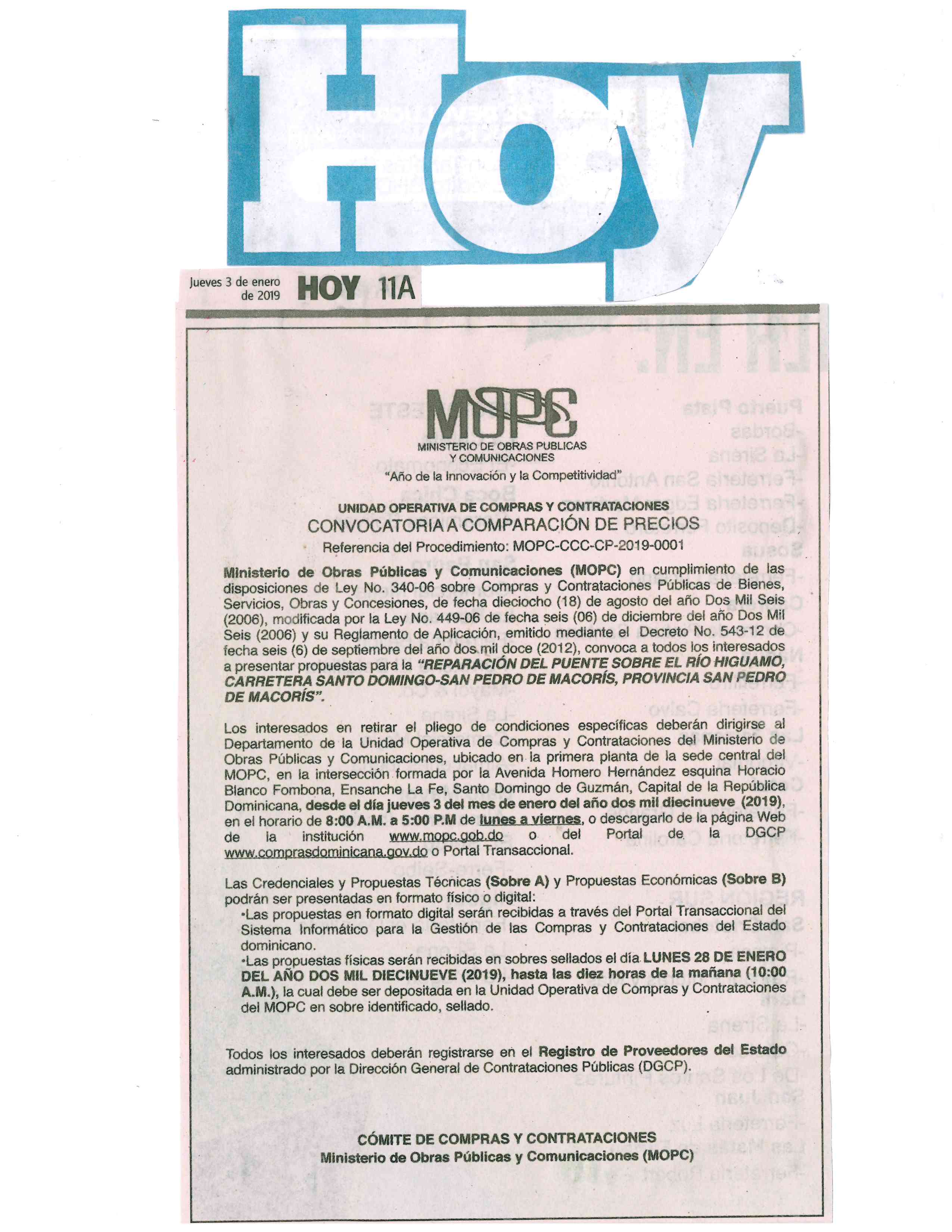 Ministerio de Obras Públicas y Comunicaciones (MOPC) en cumplimiento de las disposiciones de Ley No. 340-06 sobre Compras y Contrataciones Públicas de Bienes, Servicios, Obras y Concesiones, de fecha dieciocho (18) de agosto del año Dos Mil Seis (2006), modificada por la Ley No. 449-06 de fecha seis (06) de diciembre del año Dos Mil Seis (2006) y su Reglamento de Aplicación, emitido mediante el Decreto No. 543-12 de fecha seis (6) de septiembre del año dos mil doce (2012) y el Manual de Procedimientos para el procedimiento de Comparación de precios, convoca a todos los interesados a presentar propuestas para la “REPARACIÓN DEL PUENTE SOBRE EL RÍO HIGUAMO, CARRETERA SANTO DOMINGO-SAN PEDRO DE MACORÍS, PROVINCIA SAN PEDRO DE MACORÍS”