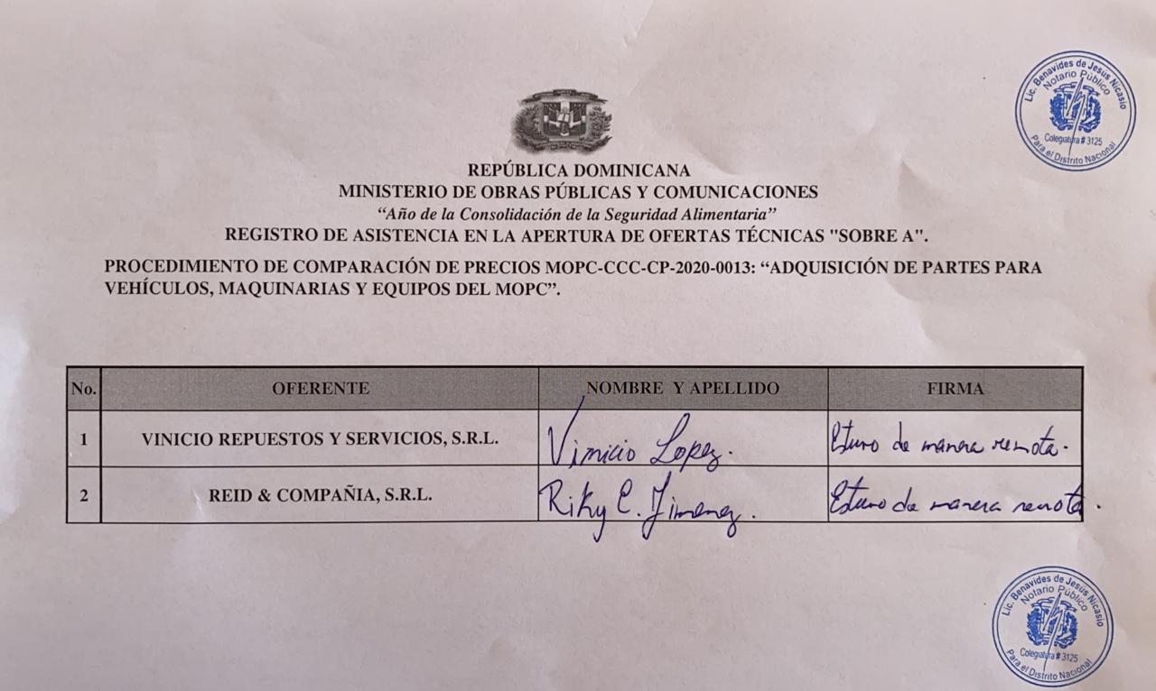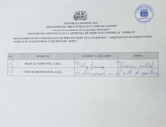 Ministerio de Obras Públicas y Comunicaciones (MOPC) en cumplimiento de las disposiciones de Ley No. 340-06 sobre Compras y Contrataciones Públicas de Bienes, Servicios, Obras y Concesiones, de fecha dieciocho (18) de agosto del año Dos Mil Seis (2006), modificada por la Ley No. 449-06 de fecha seis (06) de diciembre del año Dos Mil Seis (2006) y su Reglamento de Aplicación, emitido mediante el Decreto No. 543-12 de fecha seis (6) de septiembre del año dos mil doce (2012), convoca a todos los interesados a presentar propuestas para la “ADQUISICIÓN DE PARTES PARA VEHÍCULOS, MAQUINARIAS Y EQUIPOS DEL MOPC”