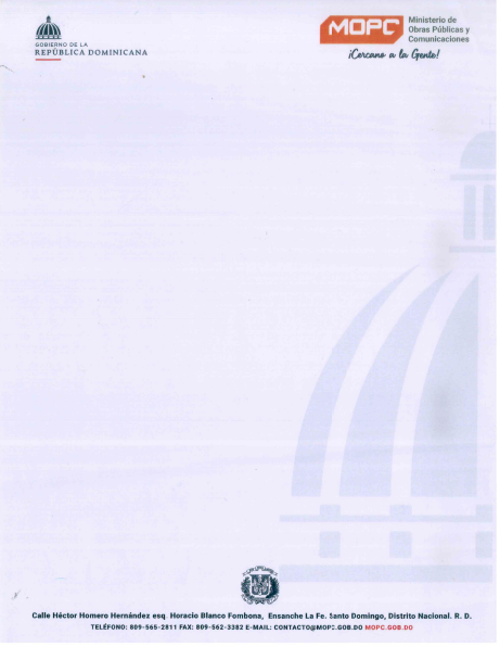 Ministerio de Obras Públicas y Comunicaciones (MOPC) en cumplimiento de las disposiciones de Ley No. 340-06 sobre Compras y Contrataciones Públicas de Bienes, Servicios, Obras y Concesiones, de fecha dieciocho (18) de agosto del año Dos Mil Seis (2006), modificada por la Ley No. 449-06 de fecha seis (06) de diciembre del año Dos Mil Seis (2006) y su Reglamento de Aplicación, emitido mediante el Decreto No. 543-12 de fecha seis (6) de septiembre del año dos mil doce (2012) y el Manual de Procedimientos para el procedimiento de Compra “SUMINISTRO Y CONFECCION DE CARPETAS IMPRESAS Y PAPEL TIMBRADO PARA USO DEL DESPACHO DEL MINISTRO DEL MOPC”, PROCESO DIRIGIDO EXCLUSIVAMENTE A MIPYMES.