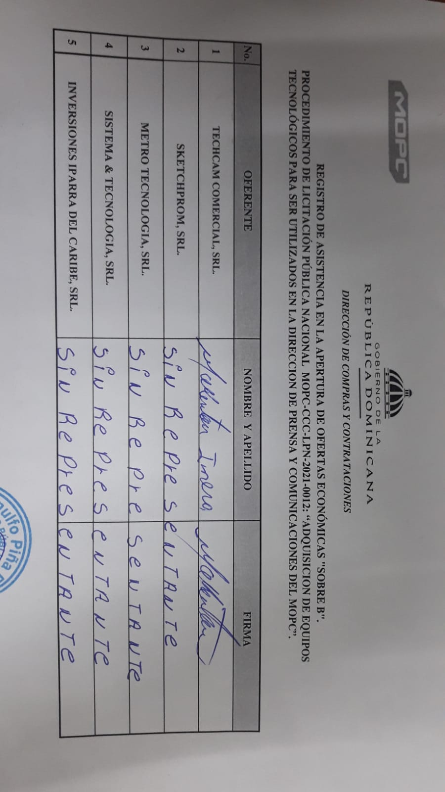 Ministerio de Obras Públicas y Comunicaciones (MOPC) en cumplimiento de las disposiciones de Ley No. 340-06 sobre Compras y Contrataciones Públicas de Bienes, Servicios, Obras y Concesiones, de fecha dieciocho (18) de agosto del año Dos Mil Seis (2006), modificada por la Ley No. 449-06 de fecha seis (06) de diciembre del año Dos Mil Seis (2006) y su Reglamento de Aplicación, emitido mediante el Decreto No. 543-12 de fecha seis (6) de septiembre del año dos mil doce (2012), convoca a todos los interesados a presentar propuestas para la “ADQUISICION DE EQUIPOS TECNOLÓGICOS PARA SER UTILIZADOS EN LA DIRECCION DE PRENSA Y COMUNICACIONES DEL MOPC”